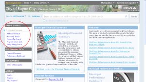 You also have online access to your utility billing (water/sewer), taxes and property assessments to check payment status, balances, etc.  Plus you can also look up all public information on any property within the City of Boyne City.